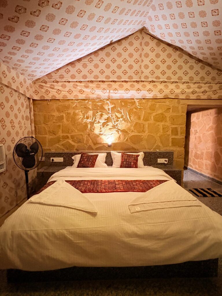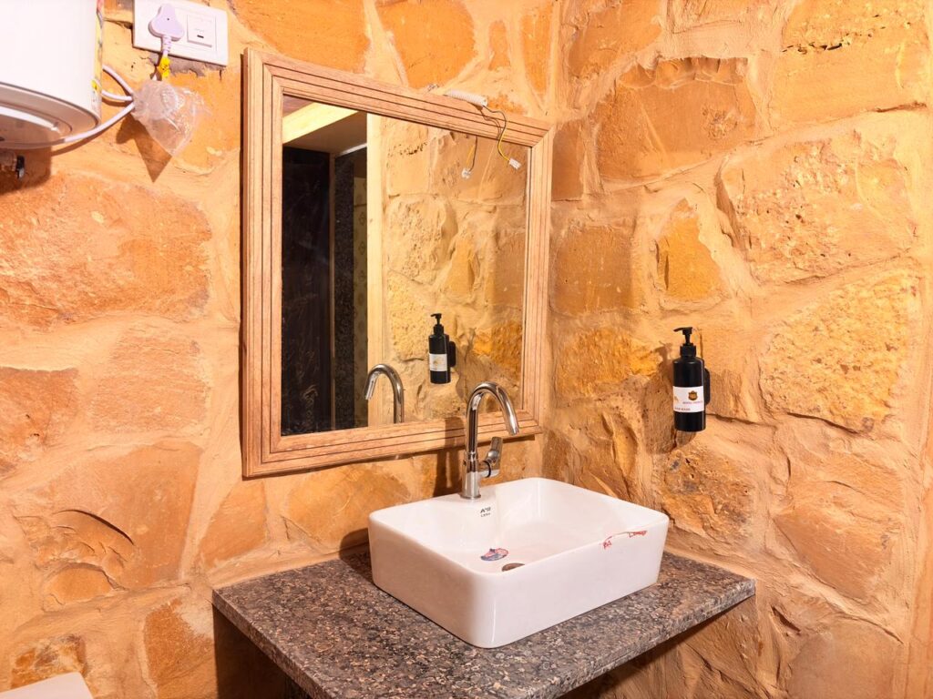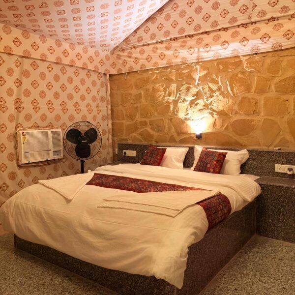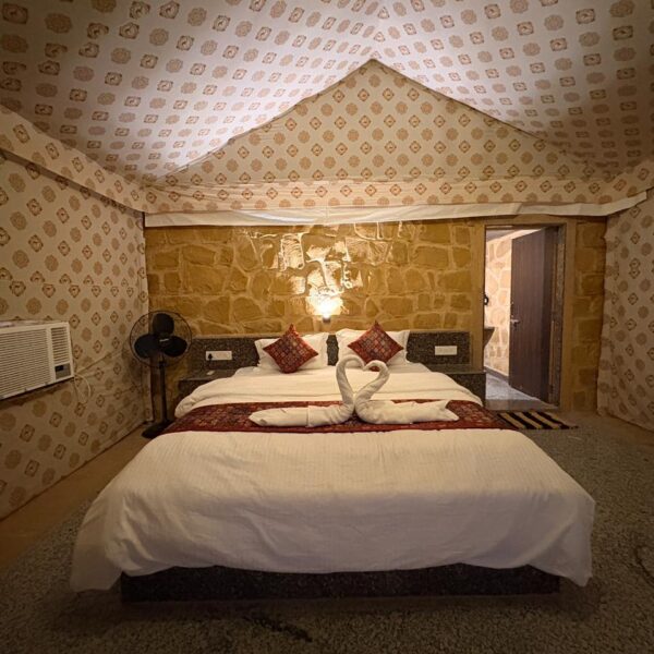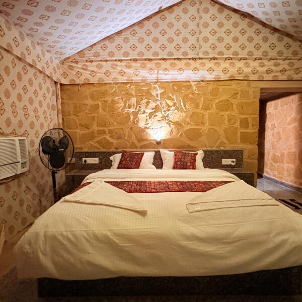 Enjoy a private sitting area to relax and soak in the breathtaking views of the golden dunes and mesmerizing sunsets. The décor combines traditional Rajasthani elements with modern amenities, offering a perfect blend of culture and luxury.